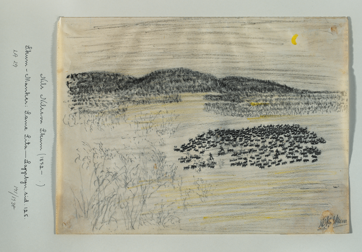 Teckning av Nils Nilsson Skum, troligen utförd mellan 1930 och 1938. Renhjord på myr i månsken. Vinter.