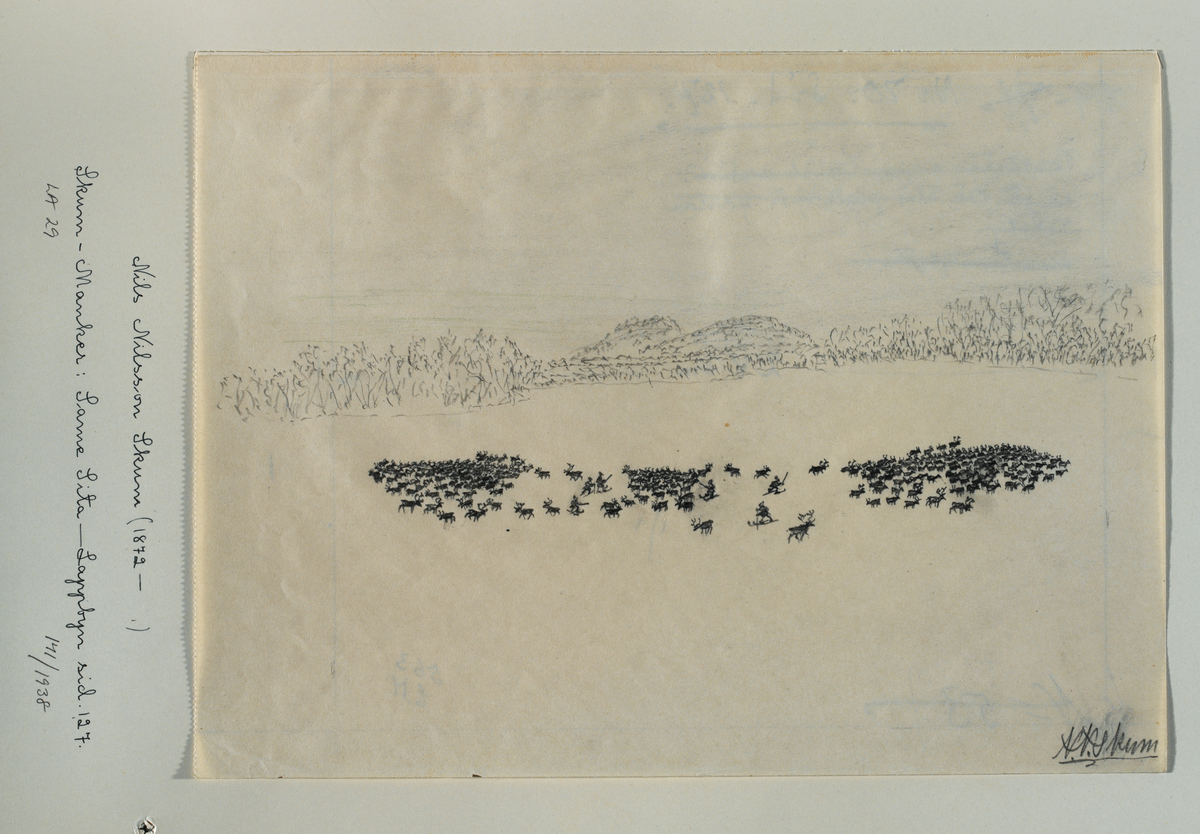 Teckning av Nils Nilsson Skum, troligen utförd mellan 1930 och 1938. Renhjord och samer på skidor i snöigt fjällandskap, renskiljning pågår. Vinter.
