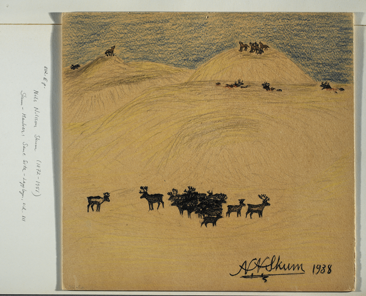 Teckning av Nils Nilsson Skum, daterad 1938. En flock vargar ylar mot natthimlen från fjälltopp. Nedanför ligger renkadaver och längre ner en grupp levande renar. Vinter.