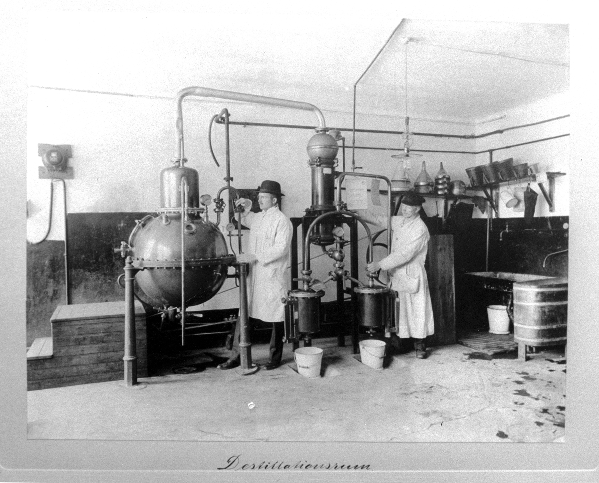 Julmustens uppfinnare Harry Roberts (till vänster) vid sin mäktiga destillationsapparat i koppar i destillationsrummet på gamla fabriken vid Vasagatan.