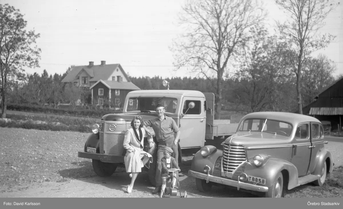 Familjefoto vid bilar i Norrbyås, 1950-tal