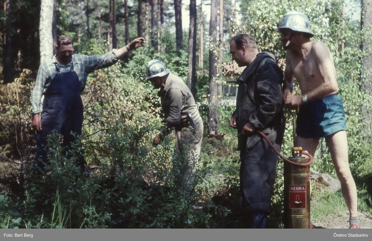 Brandman med vattenspruta på skogsbrandövning, 1960-tal