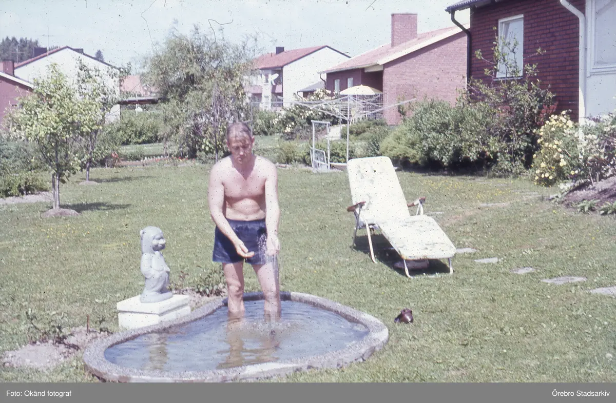 Man vid fontän vid villan i Lillån, 1960-tal