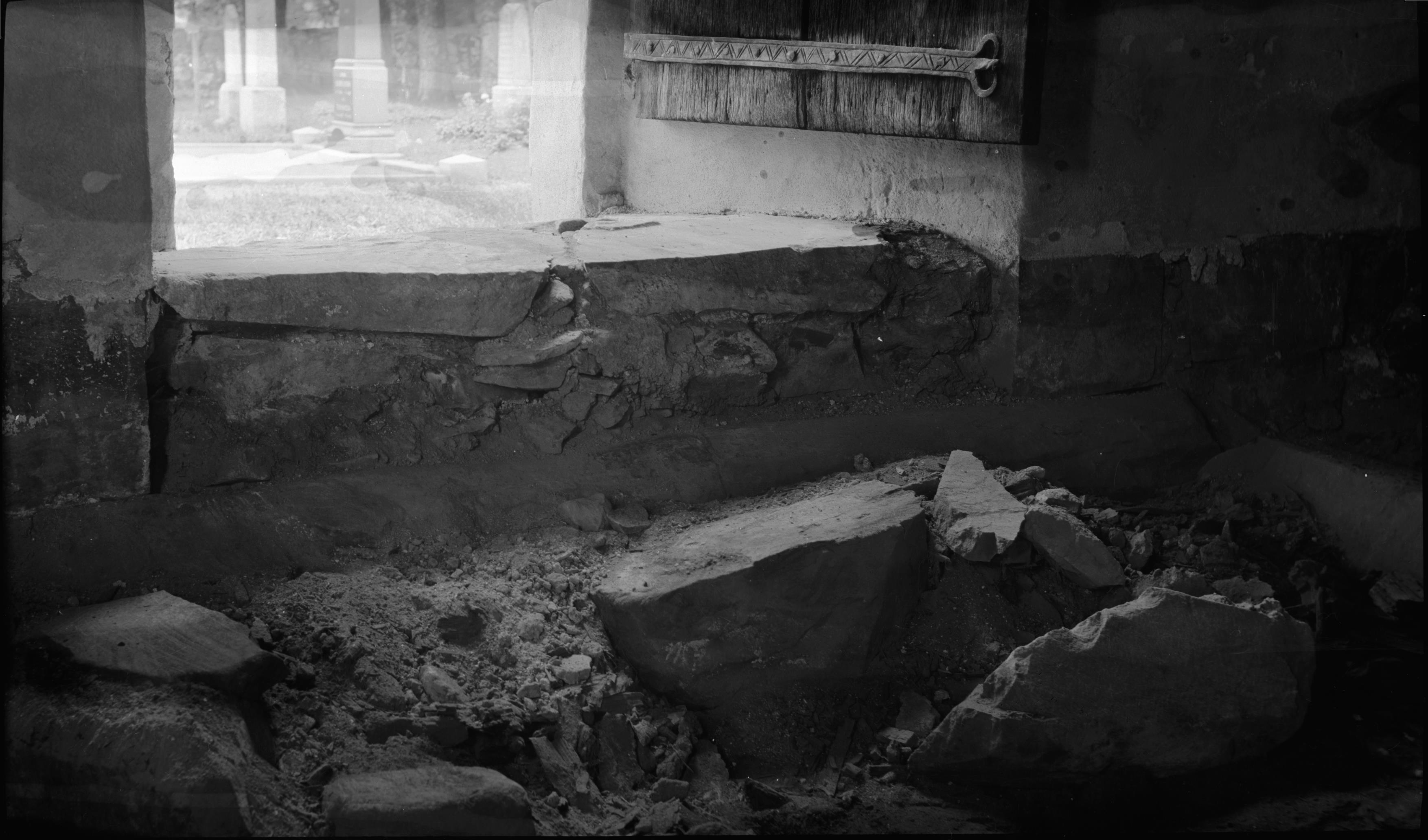 Södra ingångsdörren. Observera den långa tröskelstenen.