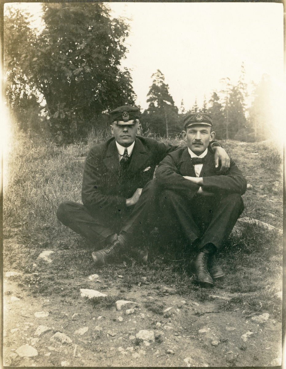 Två män. Mössemblem: V.S.S Vänersborgs segelsällskap
