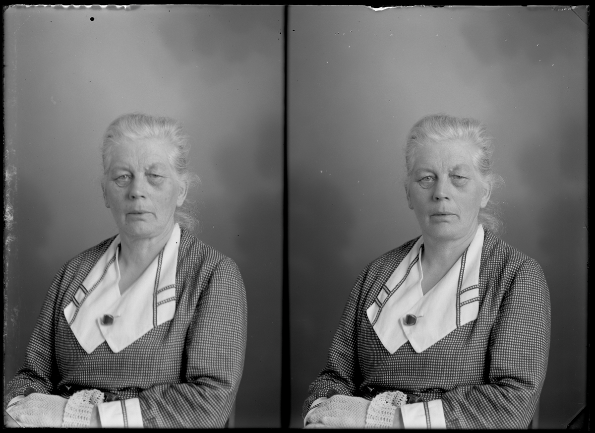 Kvinnoporträtt, passfoto. Fru Mia Eriksson, Kyrkbyn, Kolbäck.