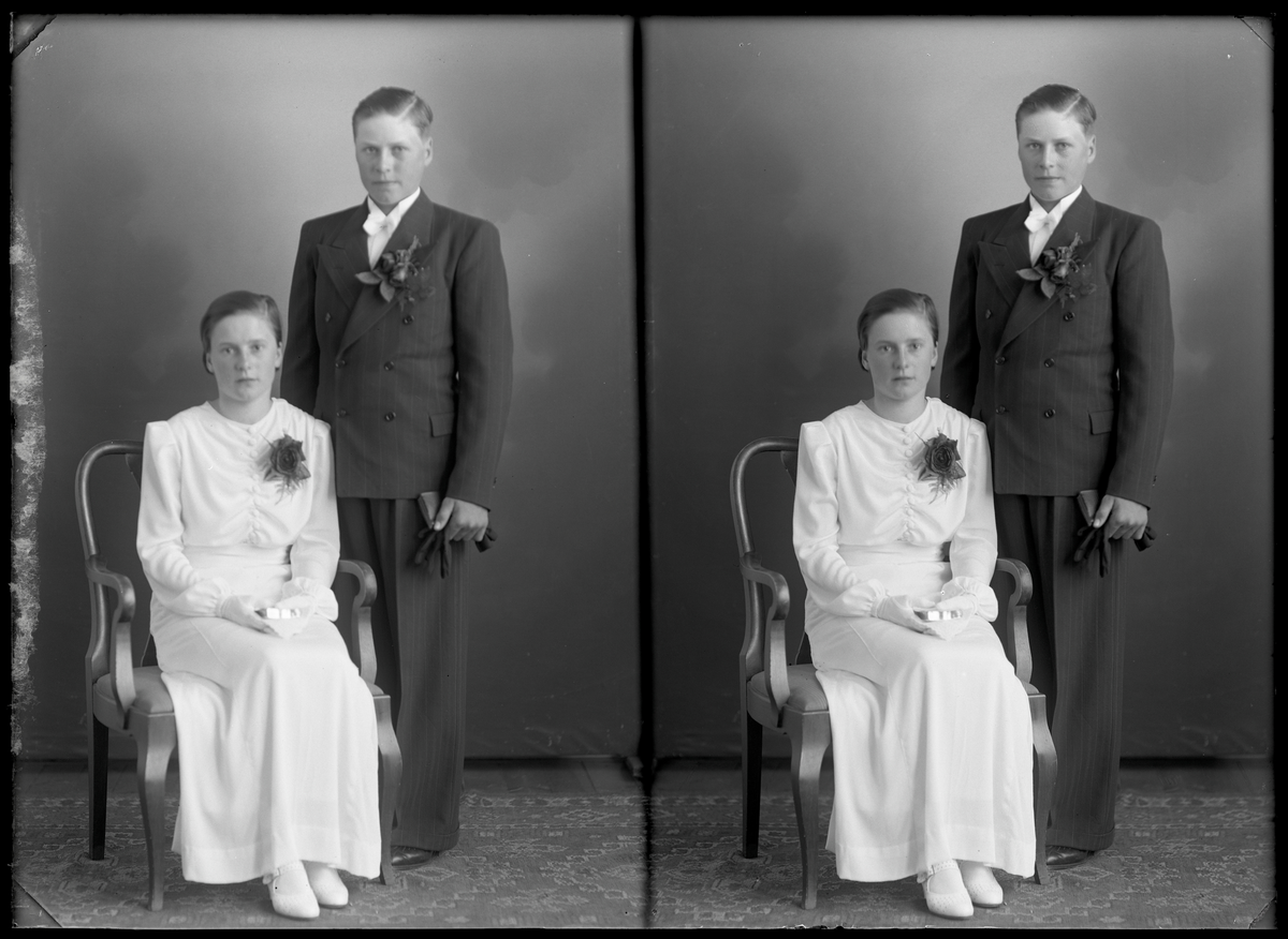 Grupporträtt, läsfoto. Erik Karlsson och Gunborg Karlsson, Åby, Kolbäck.