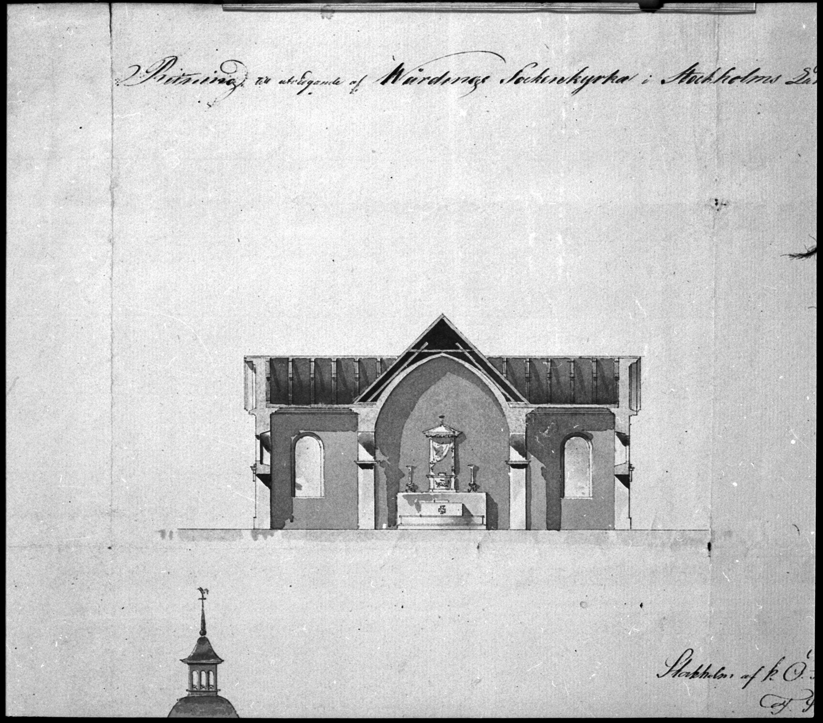 Ritning, genomskärning, kor och transept, originalritning av C. G. Blom.