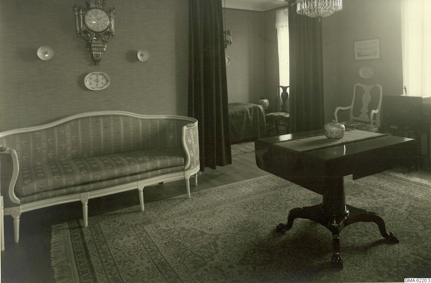 "Från köpman Nils Nilssons bostad, Lundgrensgatan 2, Göteborg, Vid väggen badkarssoffa GM:18577, därovan pendyl GM:18576." Okänd fotograf, bilden tagen före 1945 (Nilsson avlider i februari 1945).
