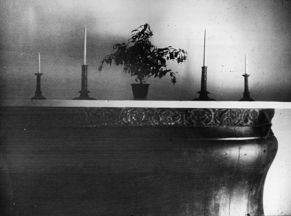 En hylla. På hyllan står det fyra stearinljus och en krukväxt. Det kan möjligen vara fotograferat i Bernhard Westins hem.