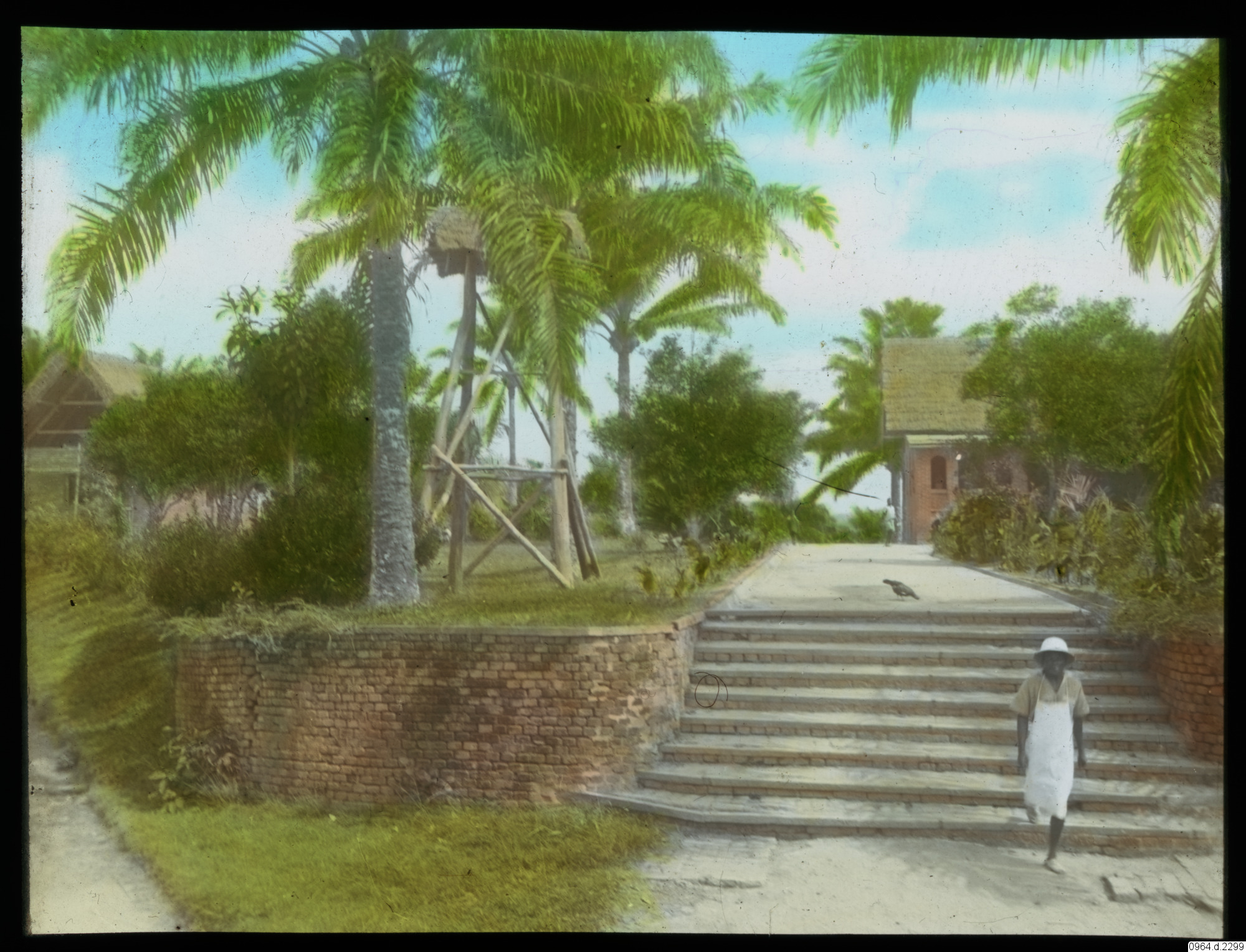 trappa, palm, byggnad, missionsstation, personer, klockstapel, fotografi, photograph