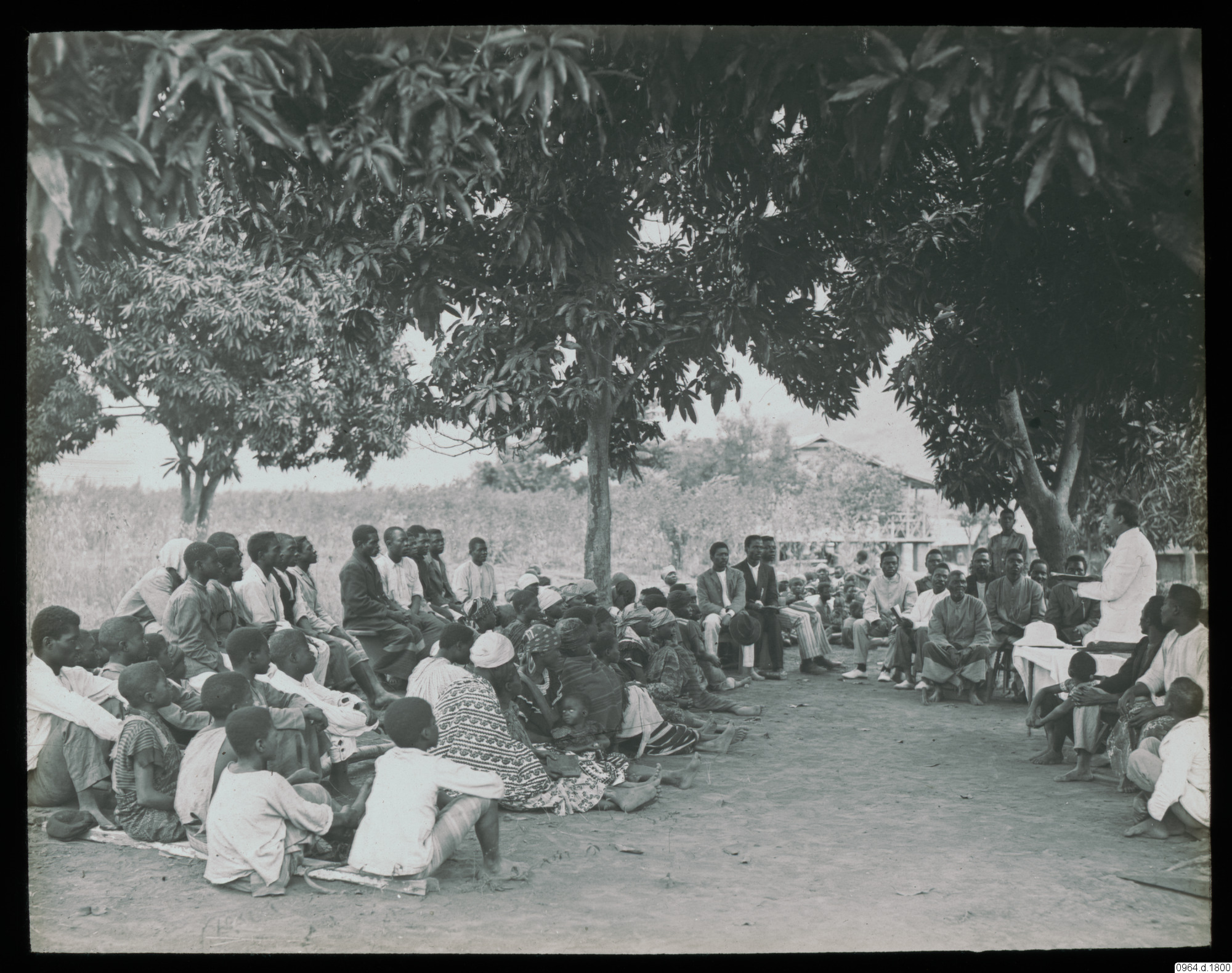 mangoträd, träd, by, gruppbild, missionär, predikan, fotografi, photograph