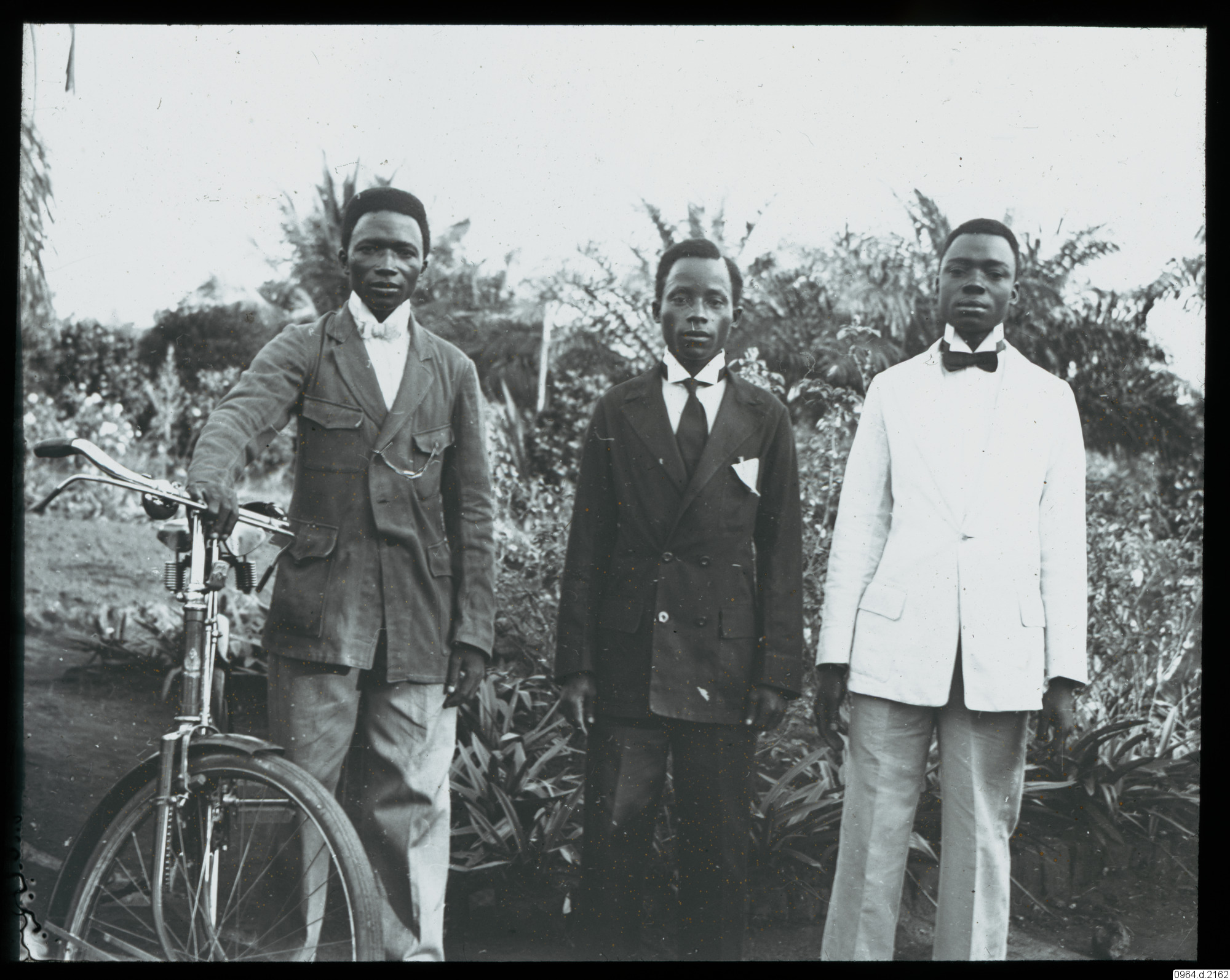 Gruppfoto. Tre män i kostym och en cykel.