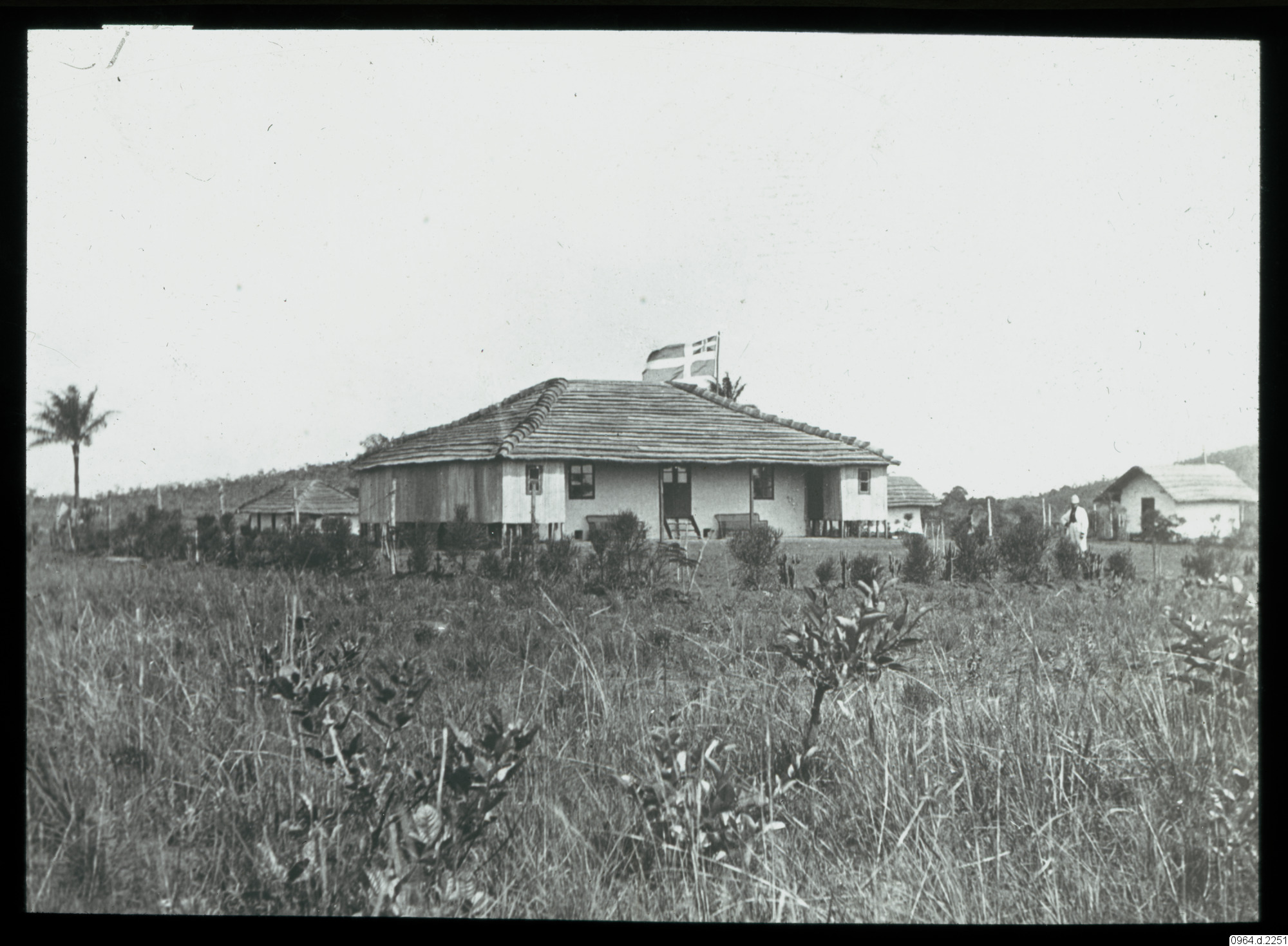 byggnad, stationshus, man, flagga, missionsstation, missionär, fotografi, photograph