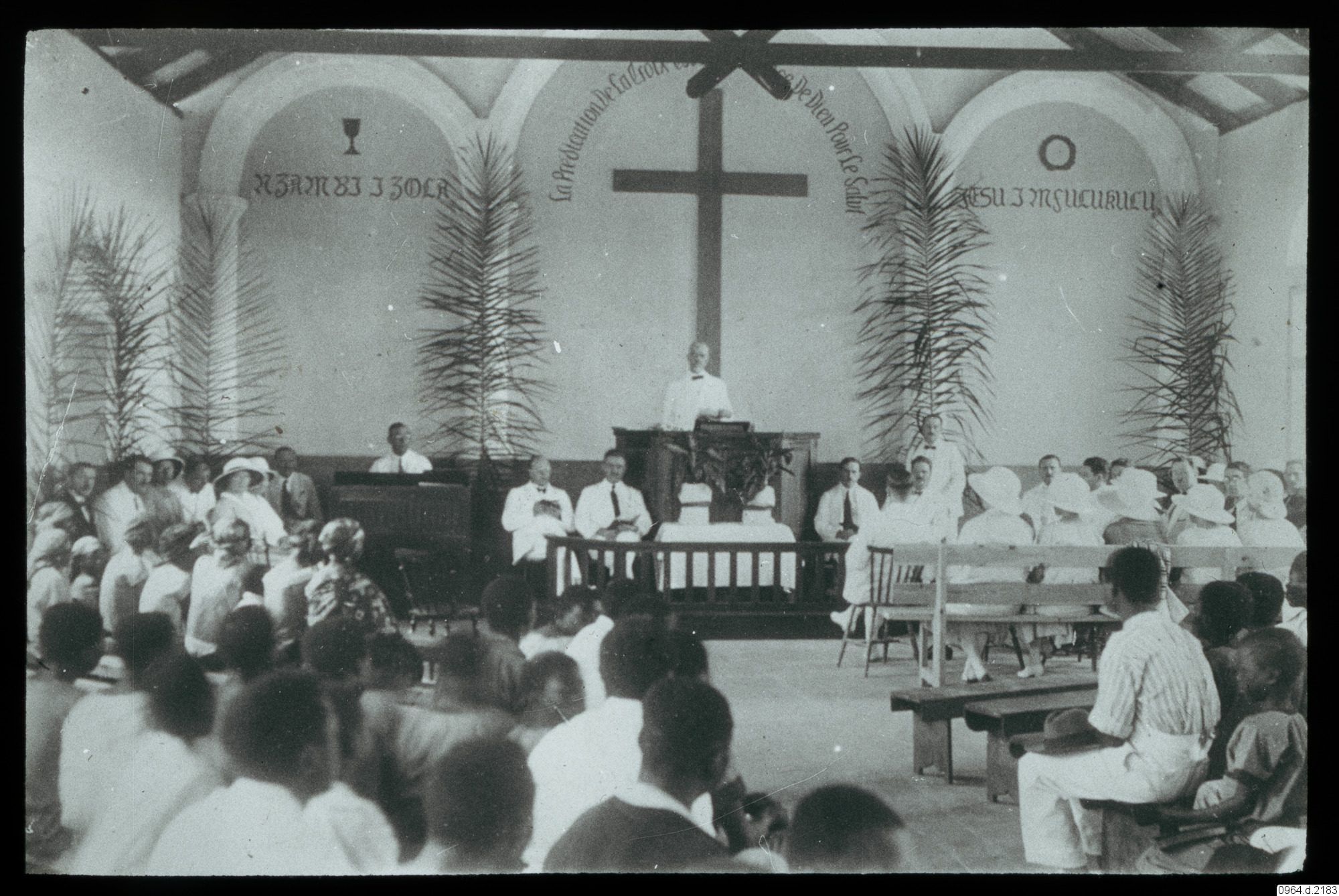 Kyrko interiör med kors och palmblad. Predikanter och församling.