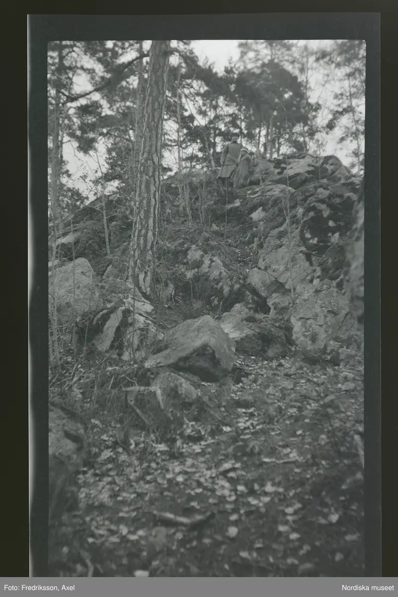 Frida och Anna-Lisa Fredriksson har klättrat upp på en stor sten ute i skogen.