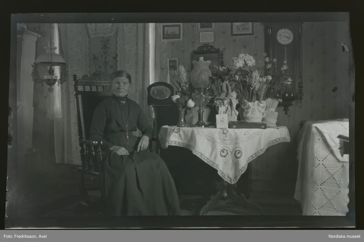 Porträtt av en kvinna som sitter vid ett bord fullt av gratulations-blommor.