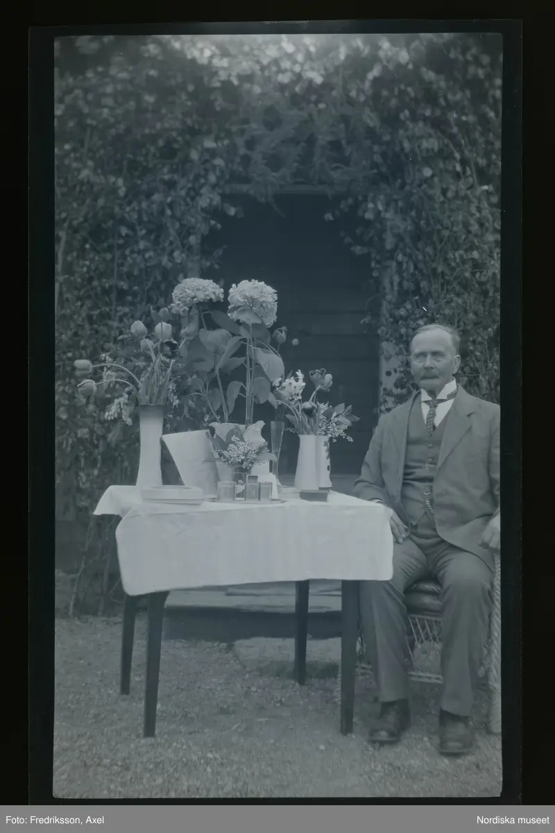Porträtt av Fredrik Vilhelm Eriksson som sitter vid ett bord fullt av gratulations-blommor.