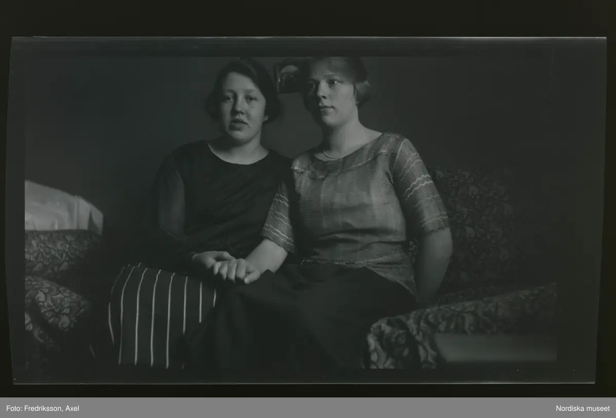 Två kvinnor sitter tätt i en soffa och håller varandra i handen.