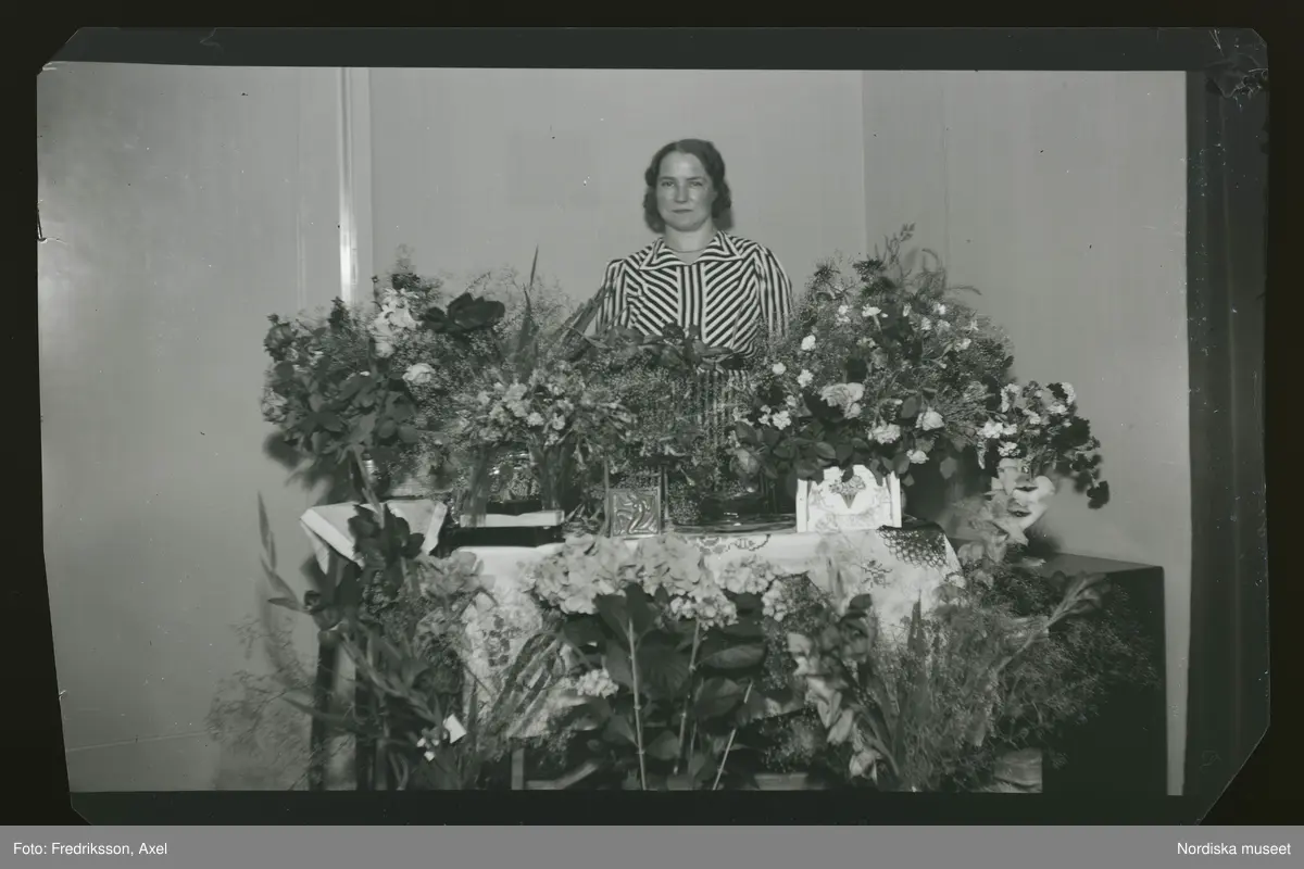 Porträtt av en kvinna som står vid ett bord fullt av gratulations-blommor.