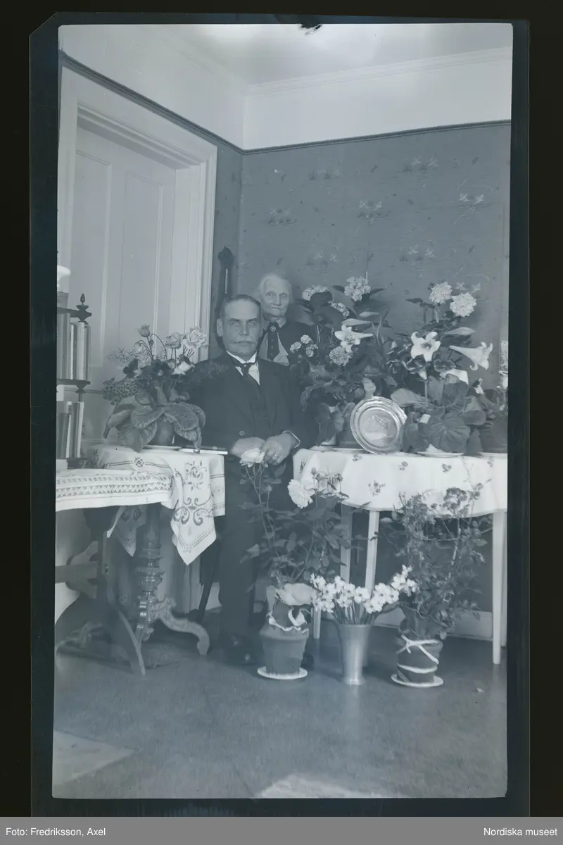 Porträtt av en man som sitter vid ett bord fullt av gratulations-blommor.