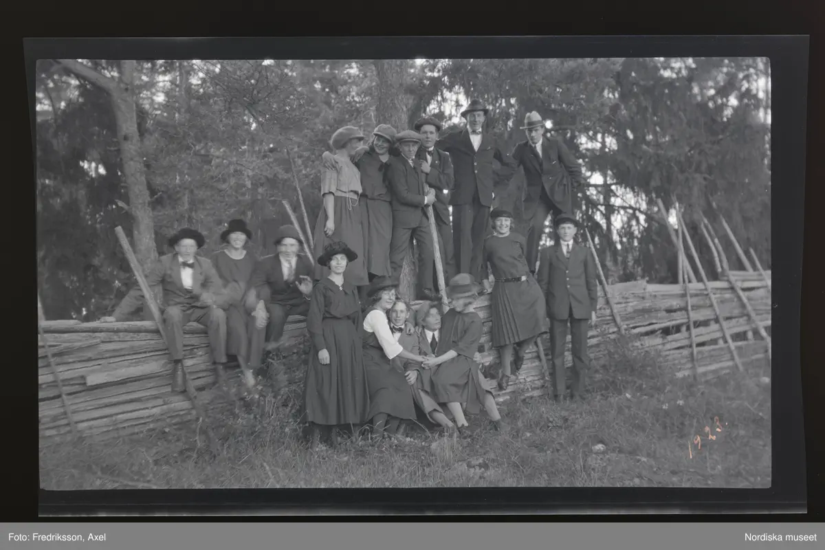 Ett sällskap unga män och kvinnor poserar vid en gärdsgård.