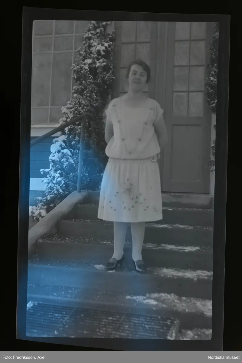 Porträtt av en kvinna, ståendes ute på en snöig trappa.