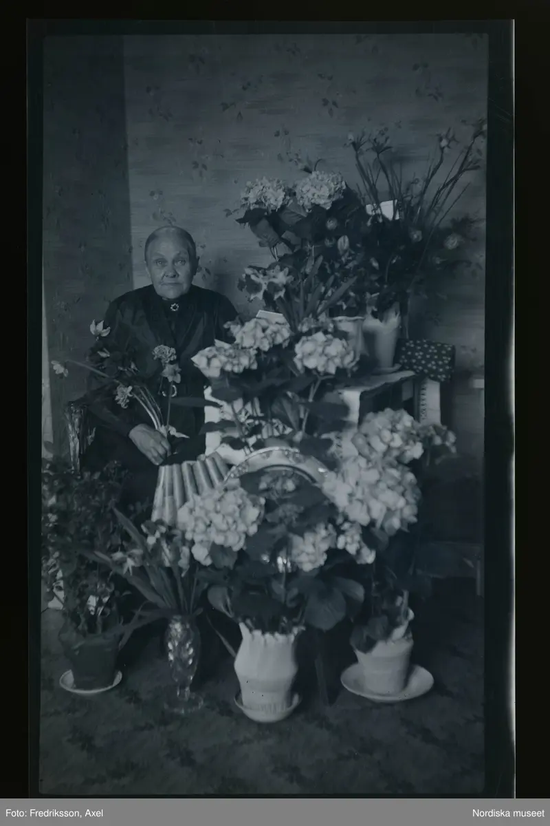 Porträtt av en kvinna som sitter omgiven av gratulations-blommor.