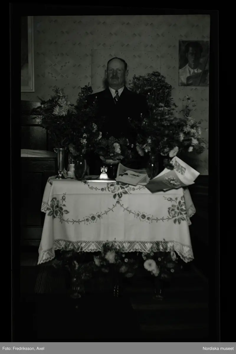 En man som står bakom ett bord med gratulations-blommor.