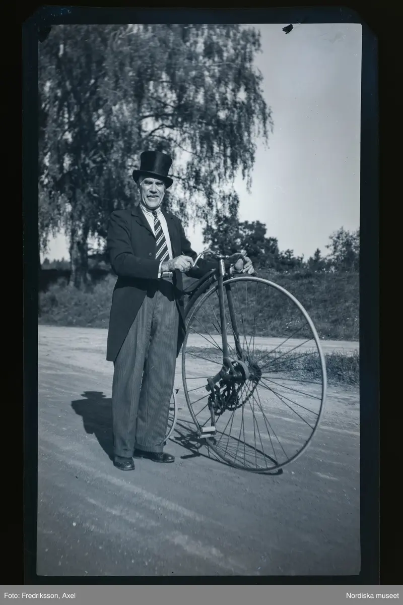 En man i hög hatt står intill en höghjuling.