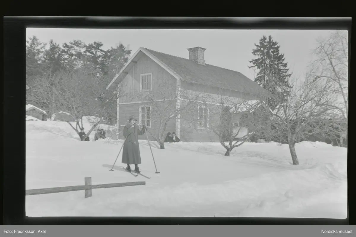 En kvinna på skidor framför ett hus. I trädgården sitter fler personer.