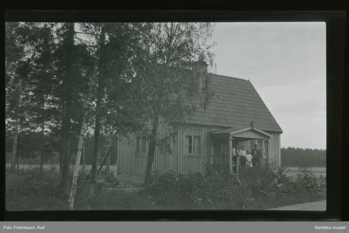 En familj står på farstubron till sitt hus.