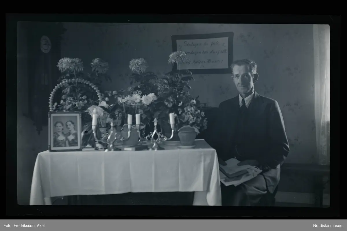 Porträtt av en man som sitter vid ett bord med gratulations-blommor.