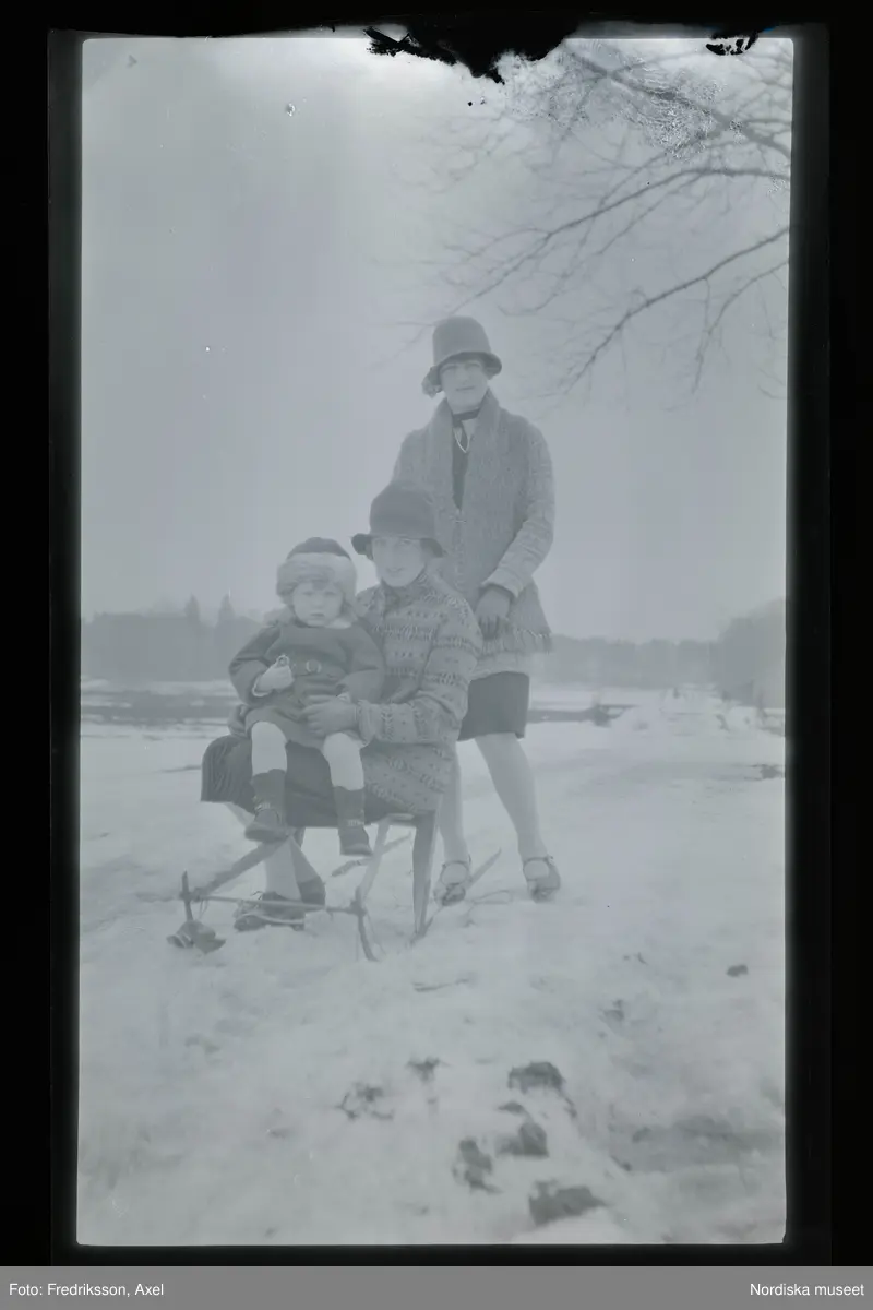 Två kvinnor och ett litet barn är ute på spark-färd i snön.