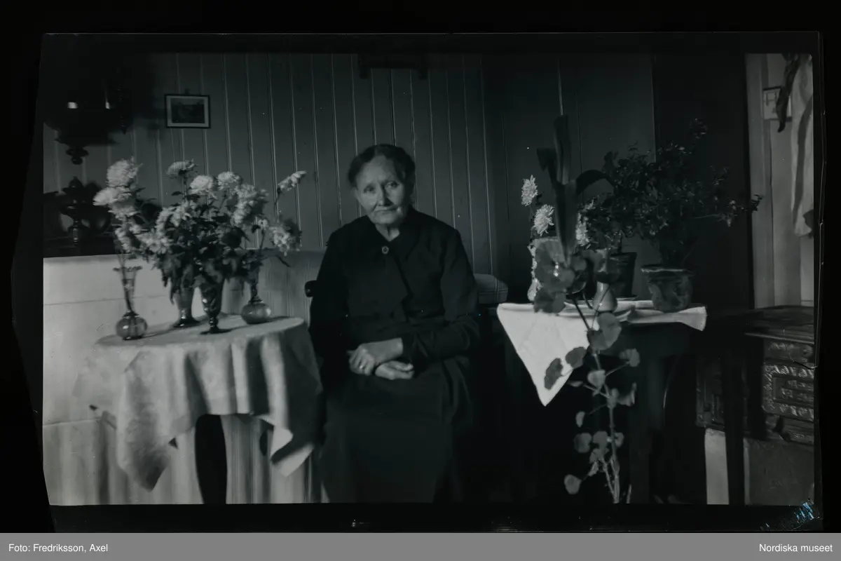 Porträtt av en kvinna som sitter vid ett bord fullt av gratulations-blommor.