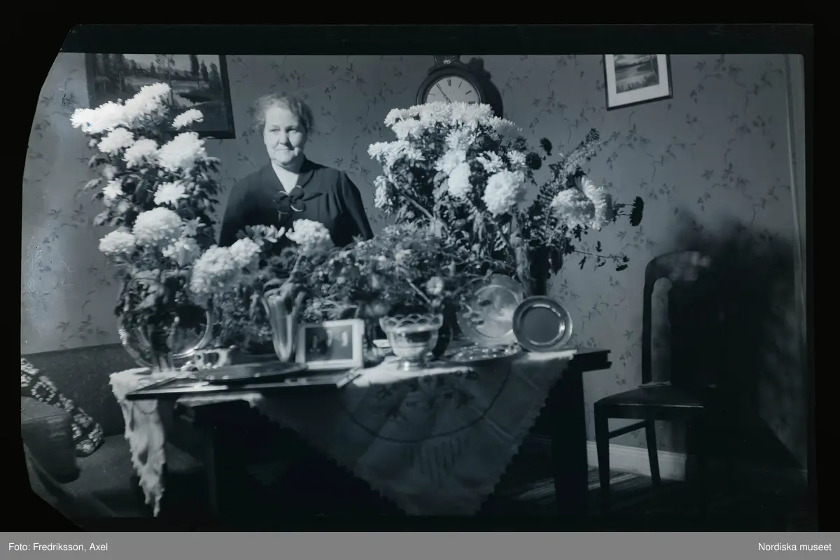 Porträtt av en kvinna som står vid ett bord fullt av gratulations-blommor.