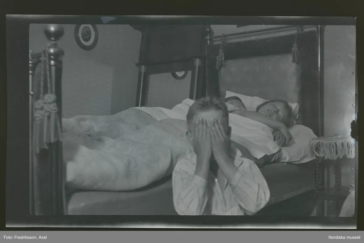 Två unga kvinnor ligger och sover i en säng. Framför sängen sitter en pojke i pyamas som gömmer ansiktet i händerna.
