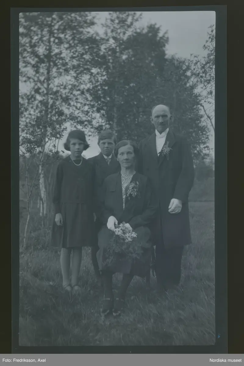 "Brudparet Agnes och Daniel Larsson och hans barn Ingrid, Ingemar."