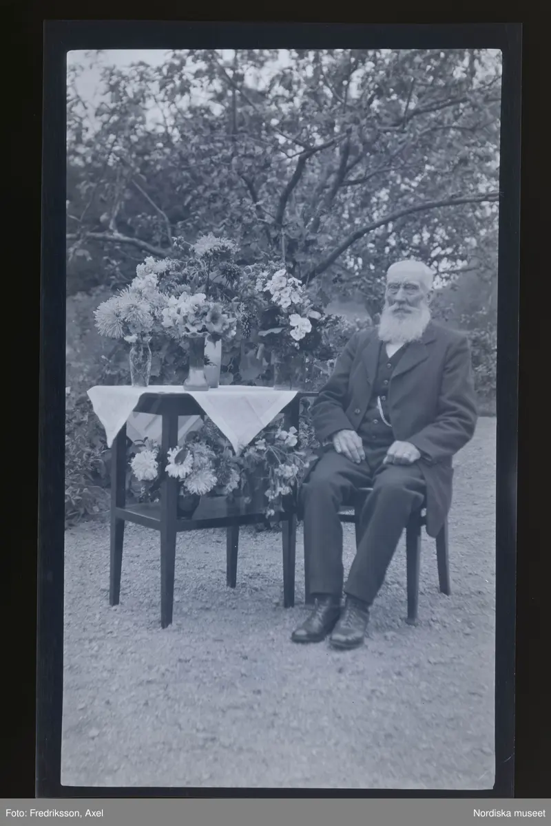 Porträtt av en man som sitter vid ett bord med gratulations-blommor.