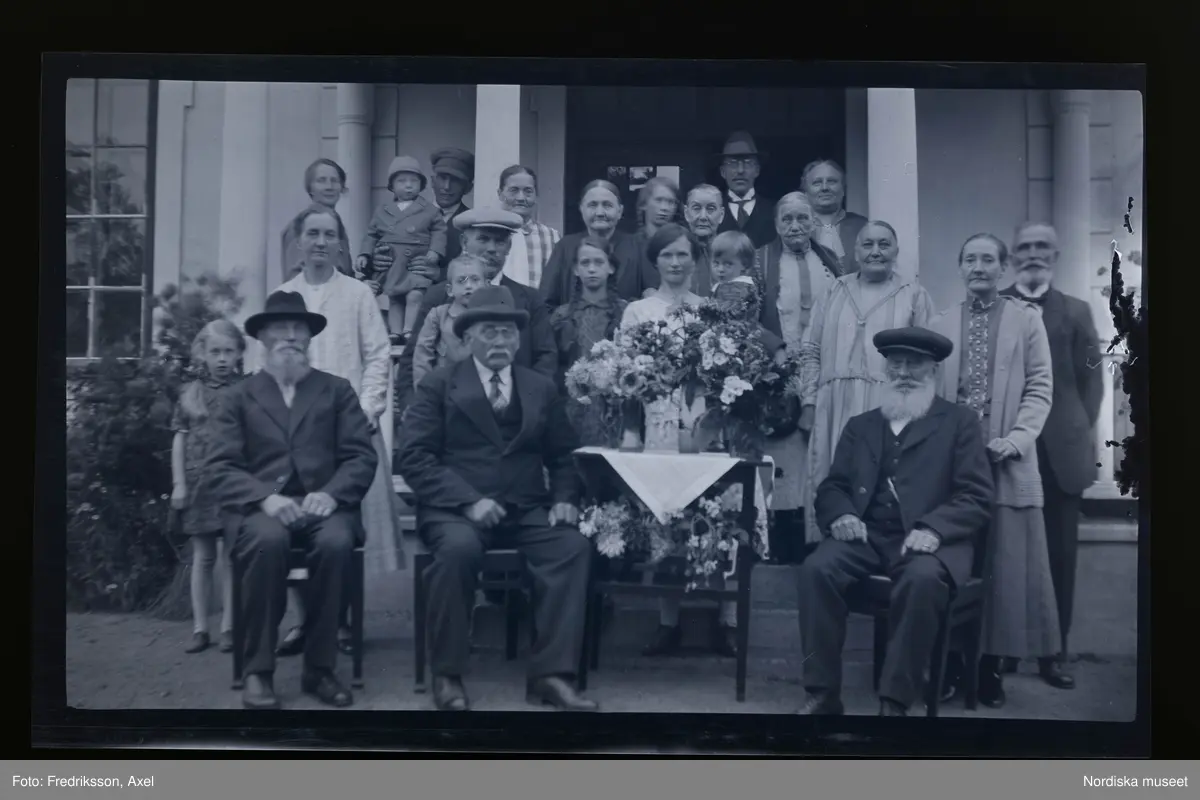 Grupporträtt. En man sitter längst fram vid ett bord med gratulations-blommor.
