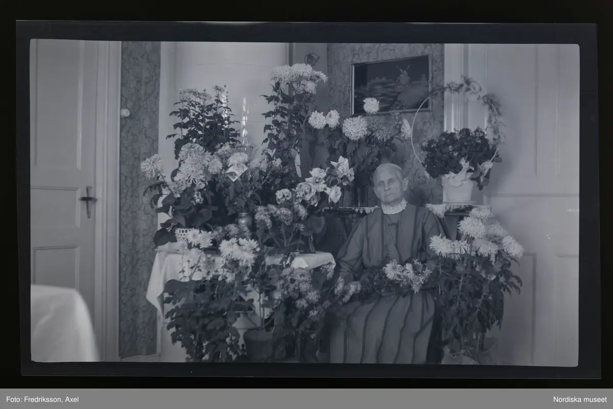 Porträtt av en äldre kvinna som sitter vid ett bord omgiven av gratulations-blommor.