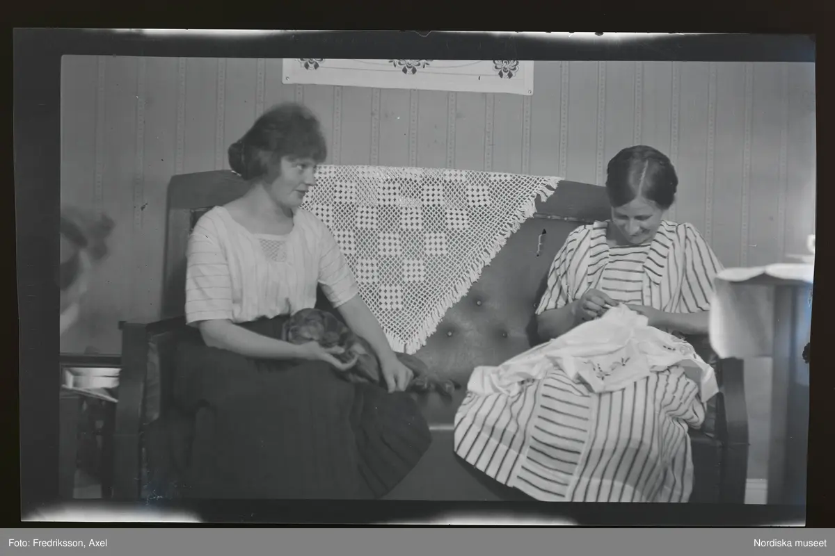 Två kvinnor sitter i en soffa. Den ena handarbetar med ett broderi i knät, den andra har en sovande hund i knät.