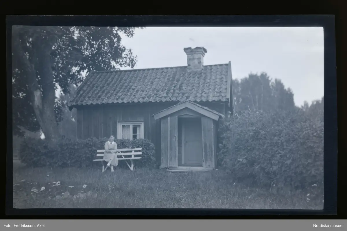 En kvinna sitter på en trädgårdsbänk framför sin stuga.