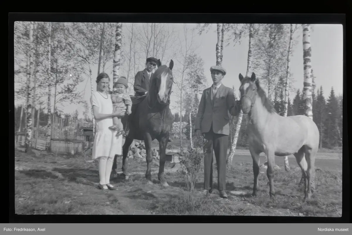 En familj och två hästar.