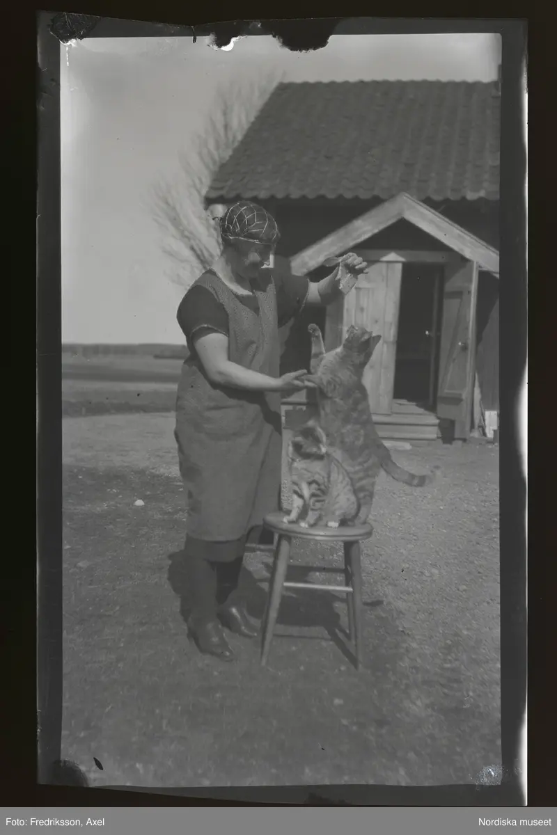 Frida Fredriksson står utomhus och leker på med två katter som sitter på en pall.