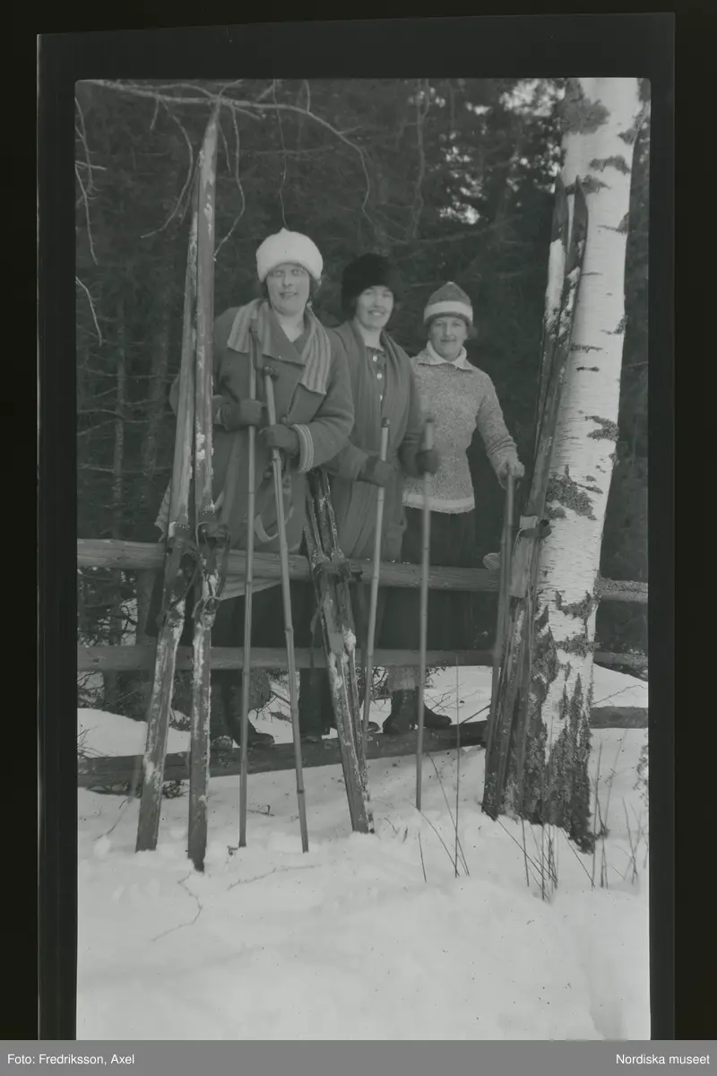 Tre kvinnor poserar ståendes på ett staket. Deras skidor står lutade mot staketet och de har stavar i händerna.