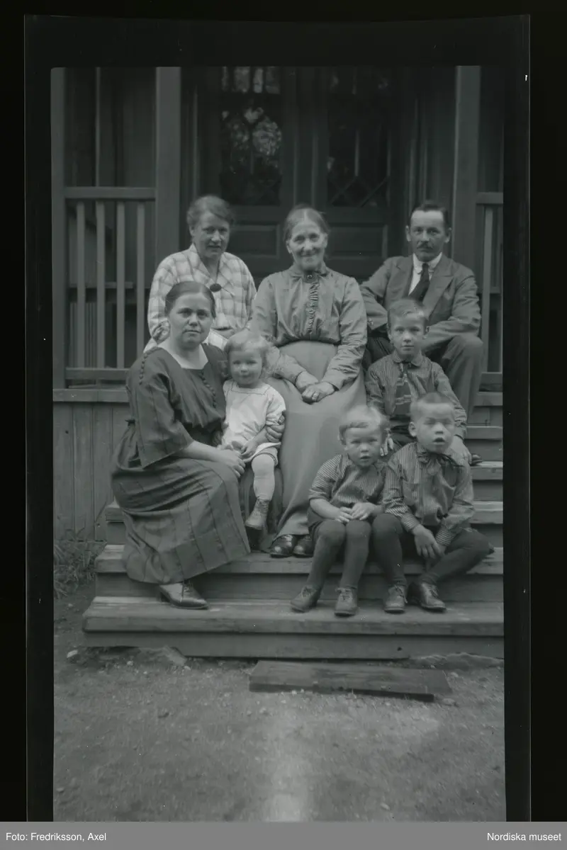 "Fru Gustavsson med döttrarna Elin och Beda m. make Axel, Gunnar trädgårdsmästare, Nisse, Olle och Lövstrand. Fogelstad"