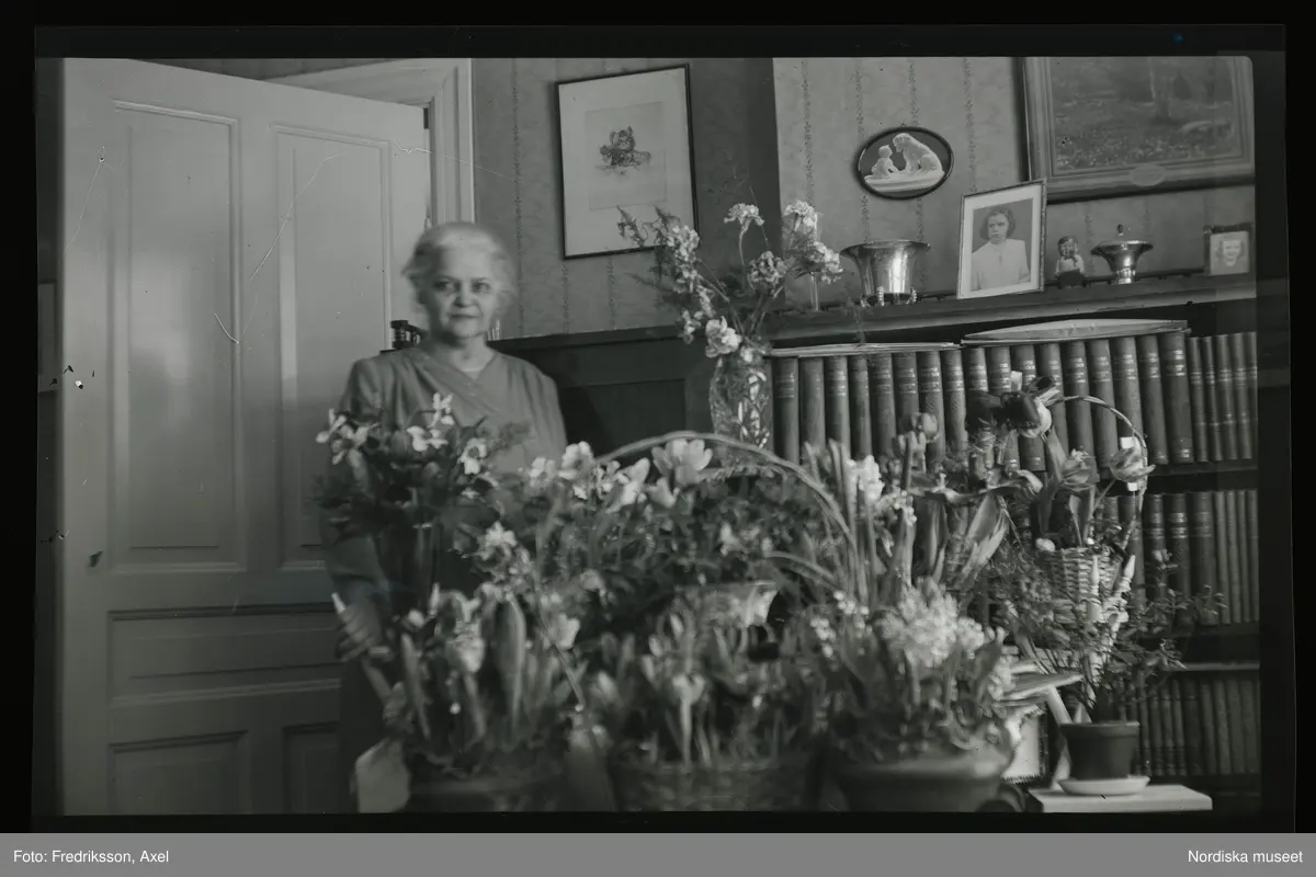 En kvinna i ett rum med en mängd gratulations-blommor.