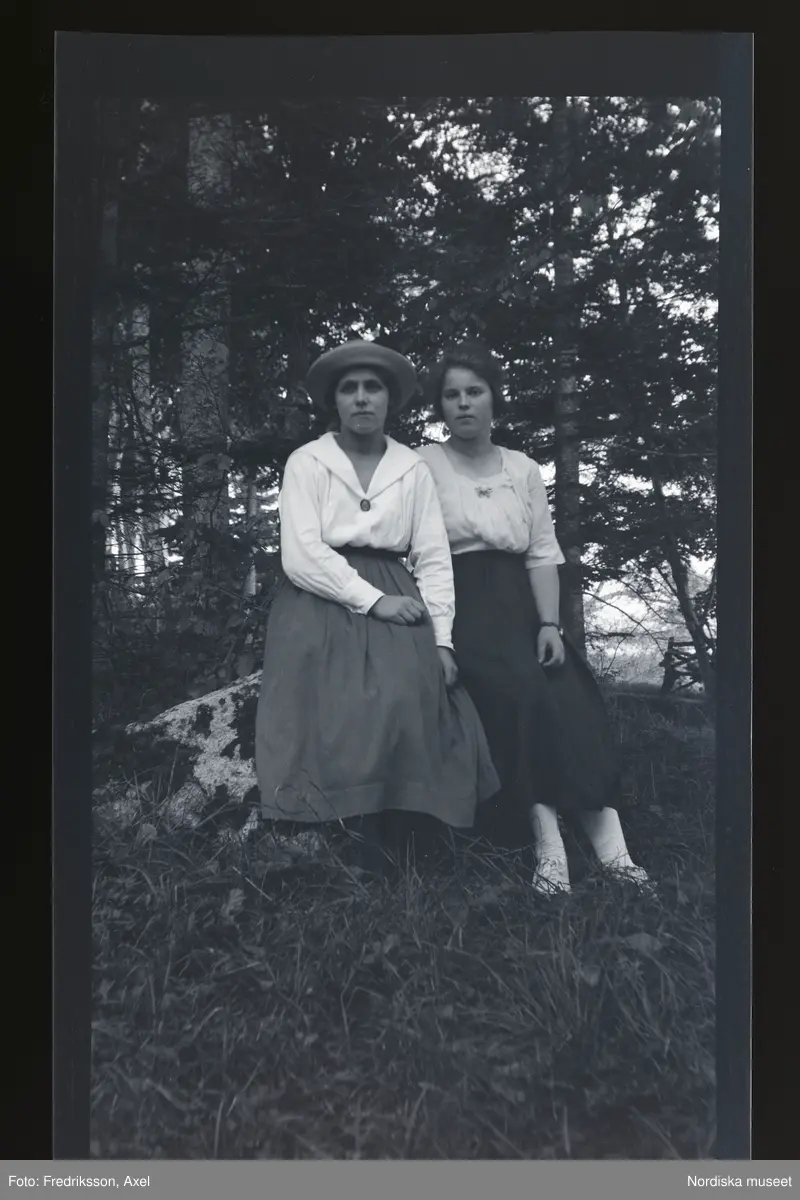 Porträtt av två unga kvinnor som sitter ute på en sten.