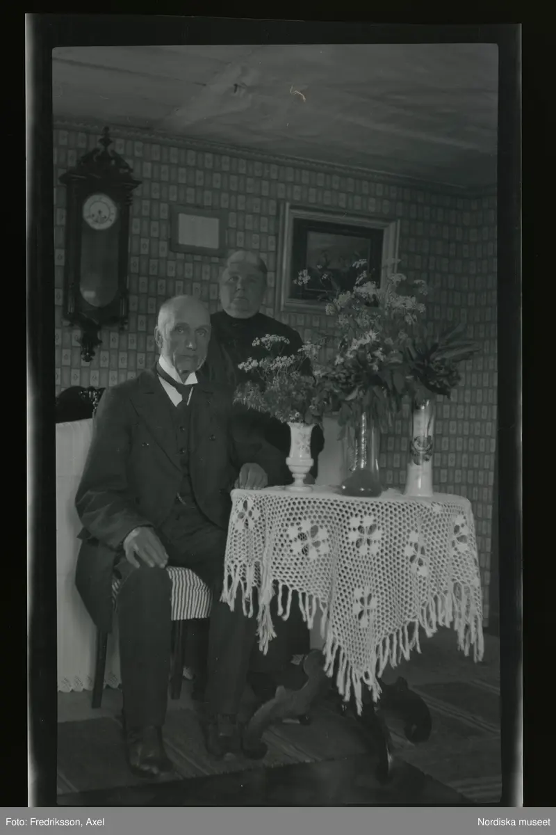 Porträtt av en man som sitter vid ett bord med gratulations-blommor, bakom honom står hans fru.